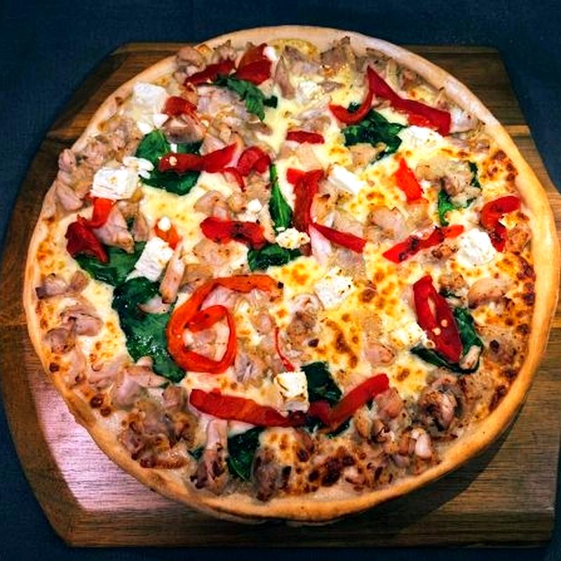 Chilli base, Spinach, Onion, Chicken, Jalapenos, Feta, topped with Chipotle Sauce×